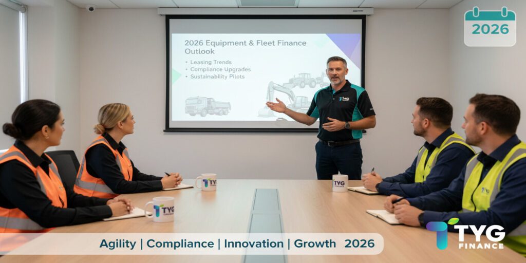 A TYG Finance industry expert presenting the 2026 equipment and fleet finance outlook to Australian operators, highlighting trends in leasing, compliance, data-driven decisions, and sustainability.